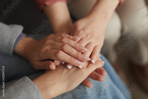 Close-up of women sitting on sofa and holding hands they supporting each other