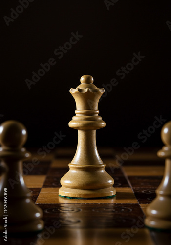 Close-up of wooden chess pieces on a chessboard, with the white queen in sharp focus. The dark blurred background adds depth and emphasizes the strategic atmosphere