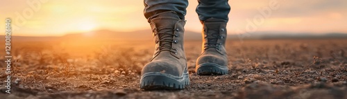 Close-Up of Worker Boots on Dry Ground During Sunset in Natural Outdoor Environment