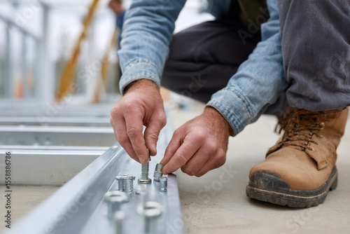 Close-up of worker tightening bolts on steel frame of modular home, clean factory floor.
