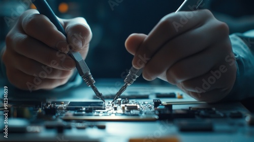 Close-up of worker's hands using precision tools to assemble mobile phone parts in office