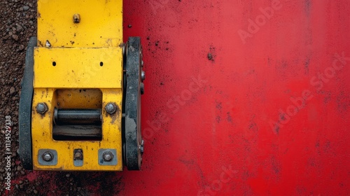 Close-up of yellow construction equipment on red surface.