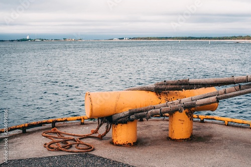 Close-up of yellow metallic mooring column or bollard on the edge of stone quay blue water background. Marine Bollard column with eye-splice on the end of rope. Loop in the end of a rope.