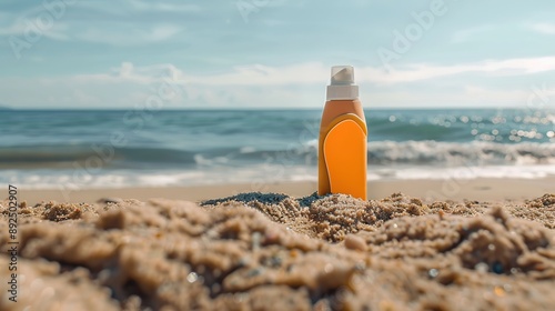 Close-up of Yellow Sun Cream Bottle on Beach Representing Summer Vacation, Skin Protection, and Ocean Swimming Concept. Perfect for Sunlight Safety, Tropical Holidays, and Beach Activities.