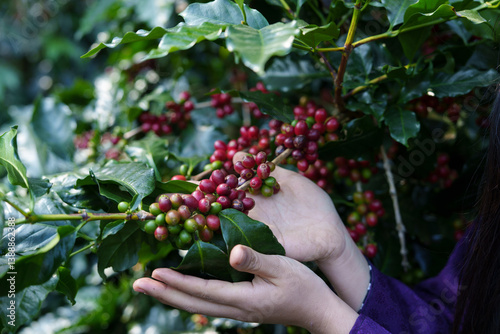 Close-up of young Asian woman picking coffee beans in a field to sell in her garden.