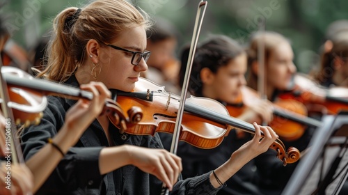 Close-up of young Caucasian woman playing violin in orchestra, wearing glasses, focused expression. Background shows other musicians blurred, teamwork dedication in classical music performance.