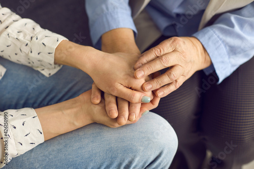 Closeup old aged wrinkled and young caucasian female hands folded together top view. Grandmother or mother and granddaughter or daughter. Caring for elderly relatives support, youth and senior age