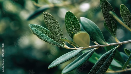 Close-up olive leaves on branch, soft focus