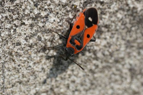 Closeup on a colorful red groundbug, Melanocoryphus albomaculatus crawling on a wall