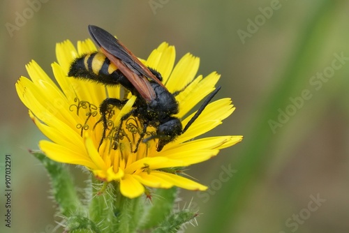 Closeup on a hairy black and yellow European Scoliid wasp, Scolia sexmaculata feeding on a yellow flower in Gard, France