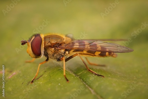 Closeup on a yellow striped, haire-eyed Syrphus torvus hoverfly