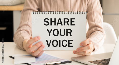 Closeup on businessman holding a card with text SHARE YOUR VOICE, business concept image with soft focus background