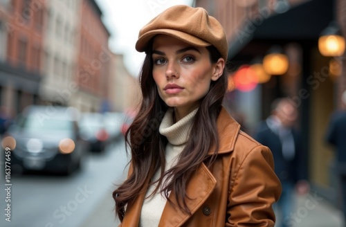 closeup on stylish young attractive girl in city street wearing brown coat and hat, urban fashion trends for fall. urban lifestyle, fashion in mocha mousse tones - color of the year 2025