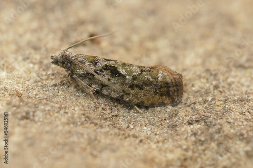 Closeup on the colorful, small Tortrix Cock's-head Bell moth, Zeiraphera isertana, isolated on wood