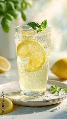 Close-up overhead image of classic lemonade drink presented in a clear glass.