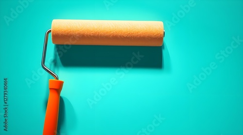 Close-up paint roller on turquoise wall. Home improvement concept. Painting tool used for interior design. Pro decorating equipment for renovation