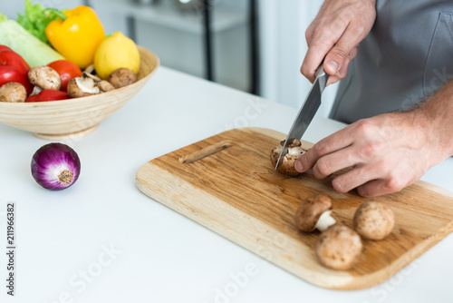 close-up partial view of man cutting fresh mushrooms on wooden cutting board
