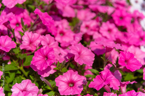 Closeup Petunia flowers (Petunia hybrida) in the garden. Flowerbed with multicoloured petunias in springtime sunny day at Ashikaga Flower Park, Tochigi prefecture, Famous travel destination in Japan