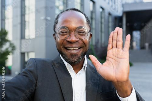 Close-up photo. An African American businessman in a suit and glasses stands outside an office center and talks on a video call. He is holding a phone, waving at the camera, smiling.