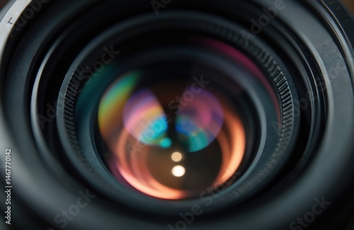 Close-up photo camera lens reflecting colorful light circles. Pro equipment for photography, video production, film, journalism. High-quality optics, digital technology for photographers,