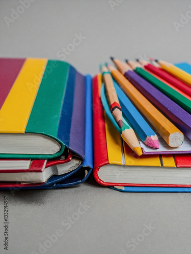 Close-up photo of a multicolored book with two pencils crossing each other on top