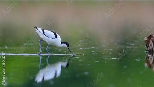 Close-up photo of a rare wader with a long thin beak curved upwards. Critically endangered species in natural environment. Czech Republic. Pied Avocet, Recurvirostra avosetta.