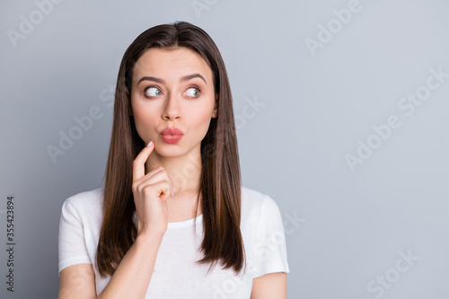 Closeup photo of attractive lady groomed hairdo look interested side empty space listen quarantine news lips pouted finger on chin wear casual white t-shirt isolated grey color background