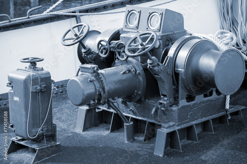 Closeup photo of bow anchor winch on ship deck