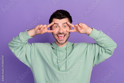 Closeup photo of cheerful funky excited brunet man positive mood cover face fingers showing v-sign symbol enjoy crazy isolated on violet color background
