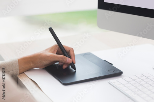 Close-up photo of designer's hand holding pen and working with graphics tablet in front of PC while working at home.