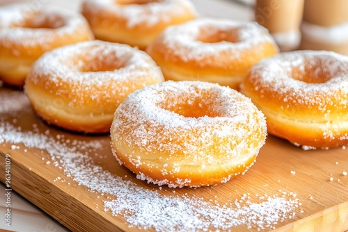 Close-up photo of doughnuts dusted with sugar, on a wooden board, with warm lighting
