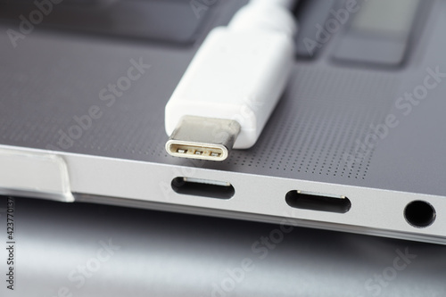 Close-up photo of laptop type-c ports, type-c cable and 3.5 jack.