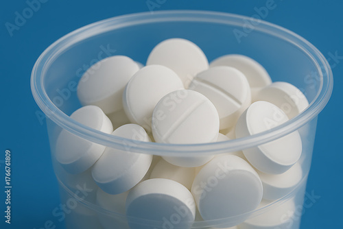 Close-up photo of round white tablets in a clear plastic container against a blue background, symbolizing medicine, health, and pharmaceutical care.
