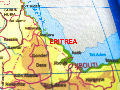 Close-up photo of the country ERITREA with its surrounding major cities on a world map