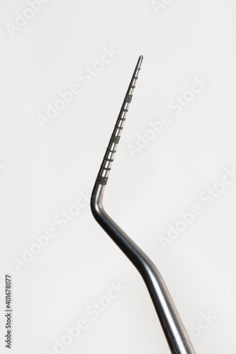 close-up photograph of a surgical instrument with titanium markings, shot against a white background