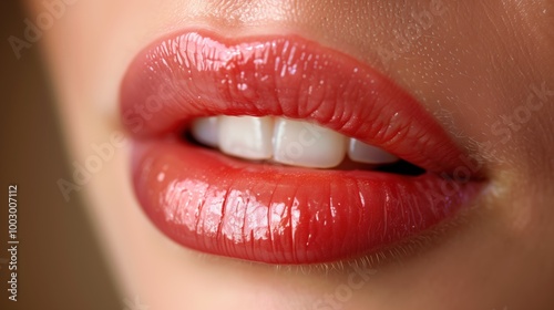 Closeup photograph showcasing Glossy Lips adorned with a Soft Coral Shade of Lipstick