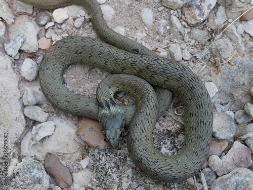 closeup photography of a snake, Natrix astreptophora, barred grass snake, picture taken in Garraf near Barcelona Spain.