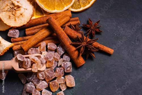 Closeup pile natural organic crystal brown rock sugar candy pile in vintage dark winter theme ingredient in sweet hot coffee spices beverage drink warm christmas mulled wine and dessert