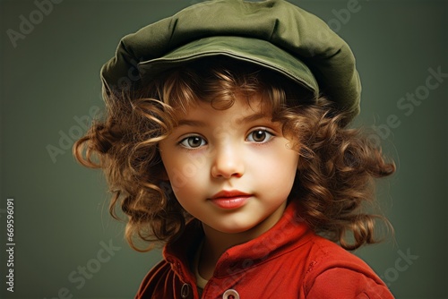Close-up portrait face nice-looking attractive lovely sweety curious cheerful cheery smart clever child, copy space isolated green pastel color background