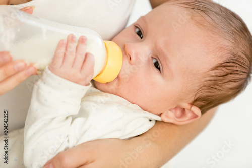 Closeup portrait of 3 months old baby boy holdin bottle with milk and eating