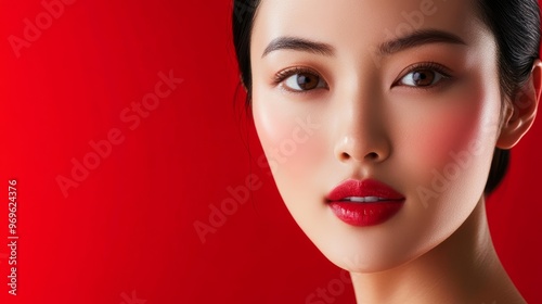 Close-up portrait of a beautiful Asian woman with red lips against a red background.