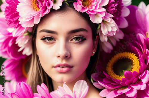 Closeup portrait of a beautiful girl with a flower wreath on her head. Generative AI.
