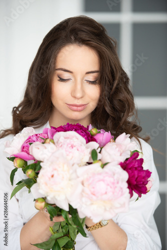 Close-up portrait of a beautiful young woman girl with gorgeous hair and a bouquet of peony flowers.