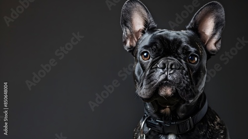 Close-up portrait of a black French Bulldog with a serious expression, set against a dark background.