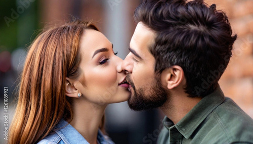 Close-up portrait of a couple whispering to each other, with one person's lips near the other's ear, creating a sense of closeness.