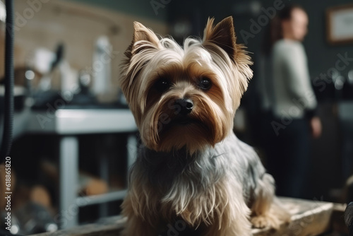 Close-up portrait of a cute yorkshire terrier during grooming, AI Generated