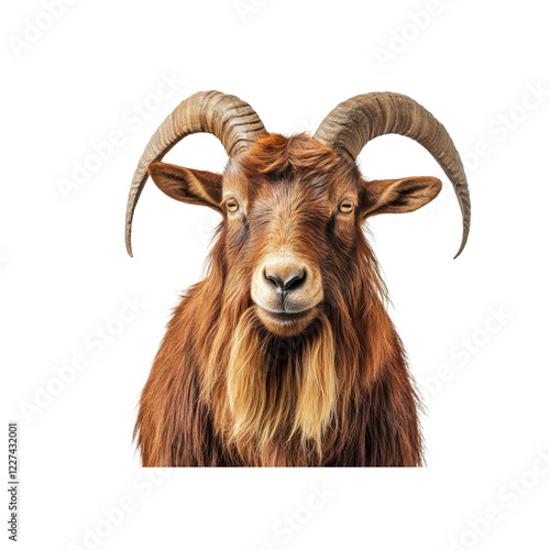 Close-Up Portrait of a Domestic Goat with Curly Horns and Fur