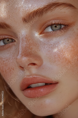 Close-up portrait of a freckled woman studio setting beauty photography natural light intimate perspective unique features