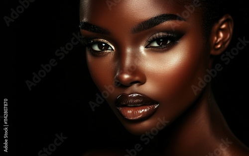 Close-up portrait of a glamorous model with smoky eye makeup, soft light illuminating her face on a solid black backdrop