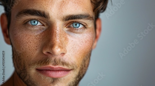 Closeup portrait of a handsome white man fashion model with natural makeup and skincare. Beauty & skin products, Copy space